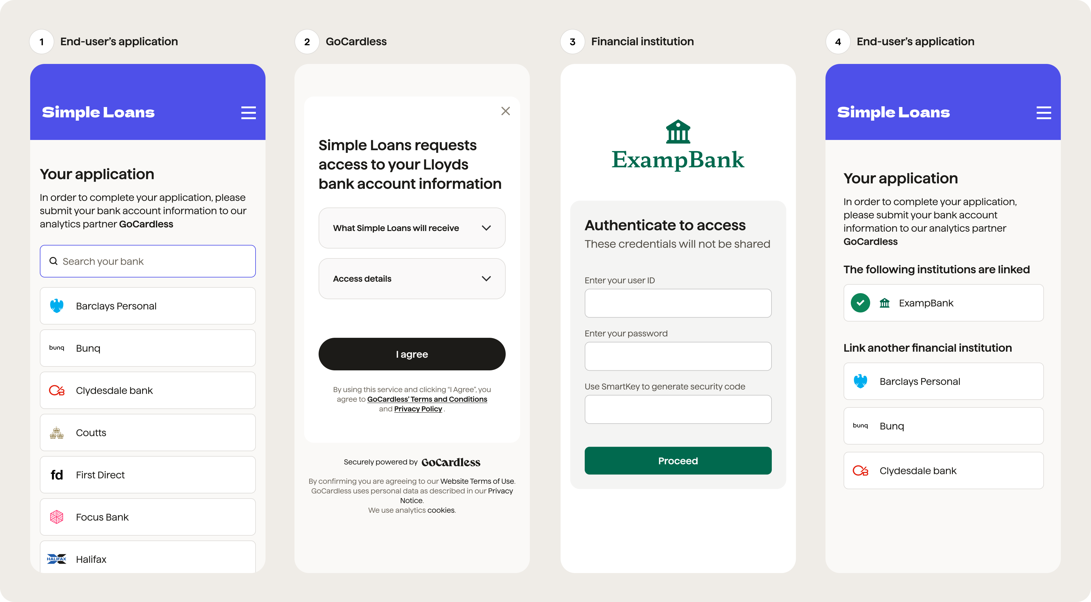 (3) The financial institution provides an interface for the end user to link their account data. This view is developed and hosted by the financial institution, therefore, neither you nor GoCardless can influence the look and feel of this view*. The financial institution view depends on each financial institution.