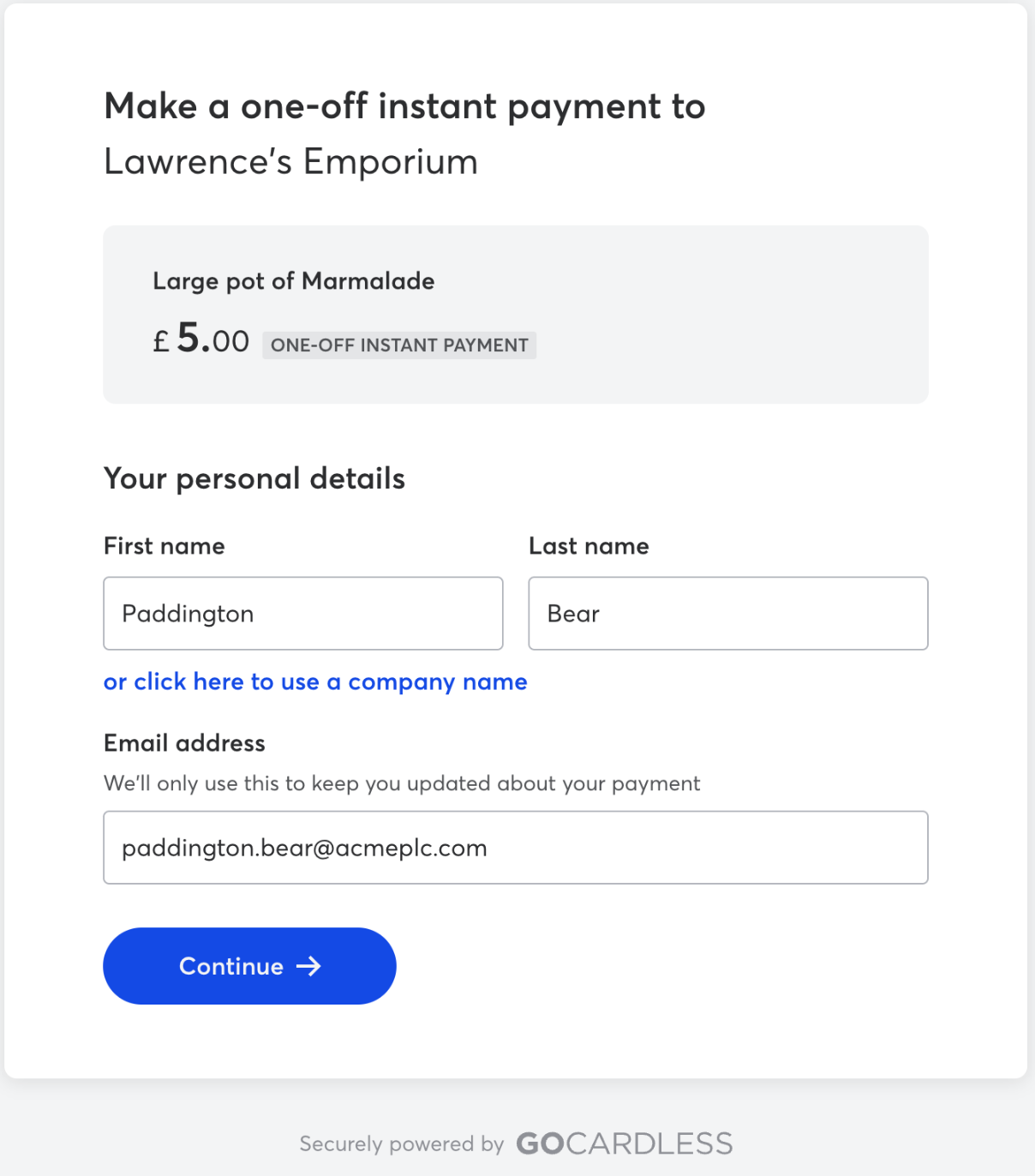 Doing so will mean that the customer won’t have to complete the customer details page in the Billing Request Flow. They will start the journey further along.
