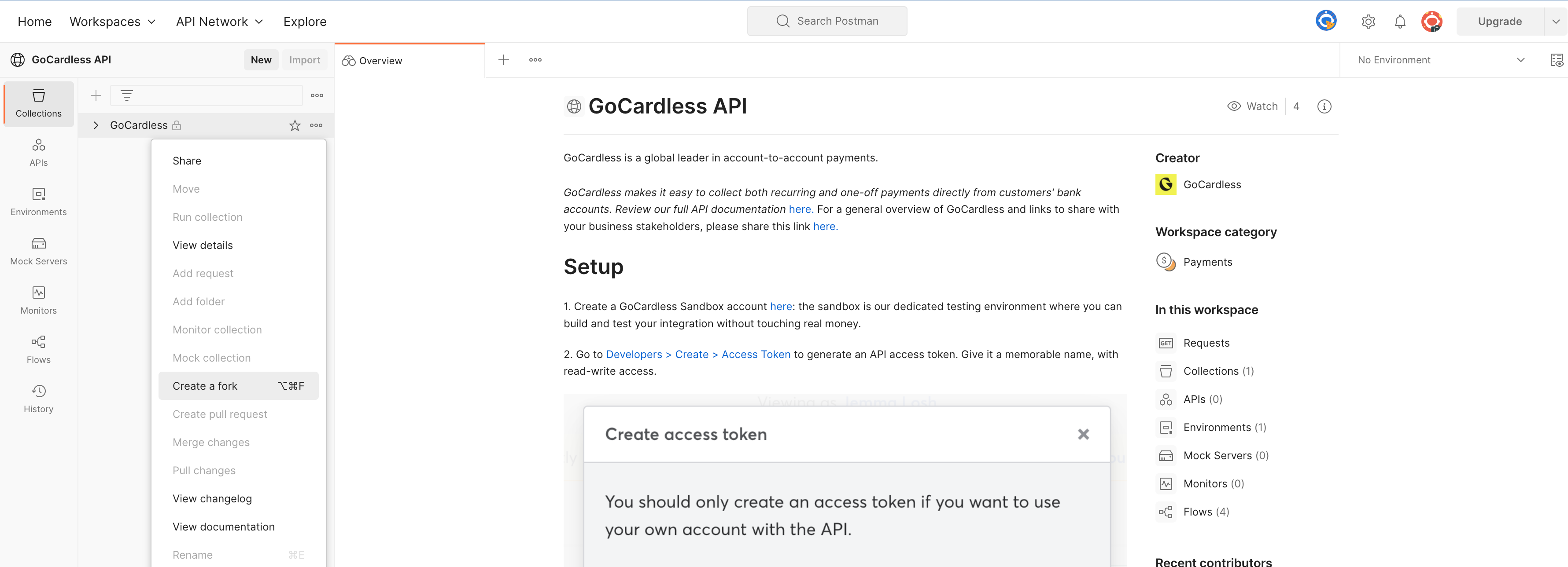 From within the Gocardless's public workspace, fork the GoCardless API collection: