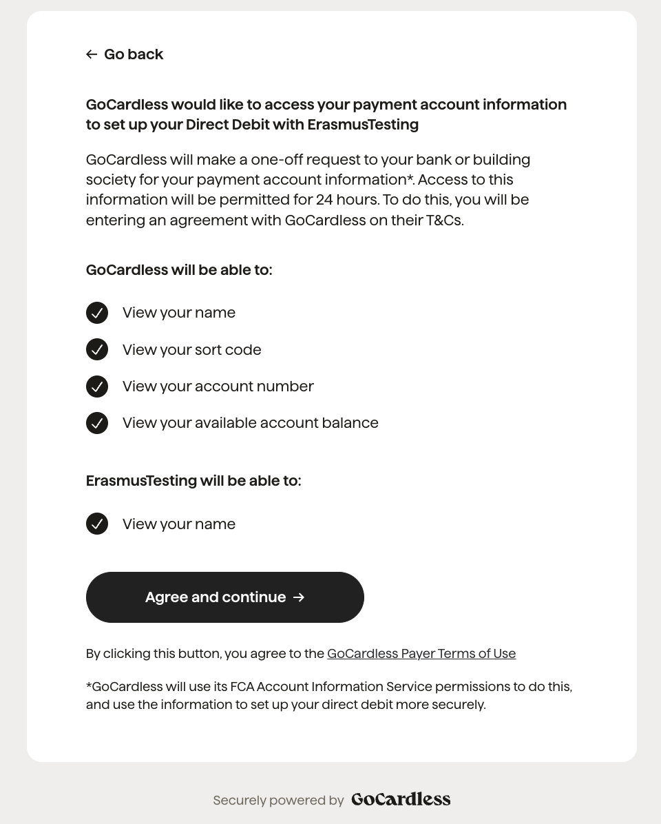 View confirmation that the direct debit has been set up and the payment has been successful once the bank authorisation is complete.