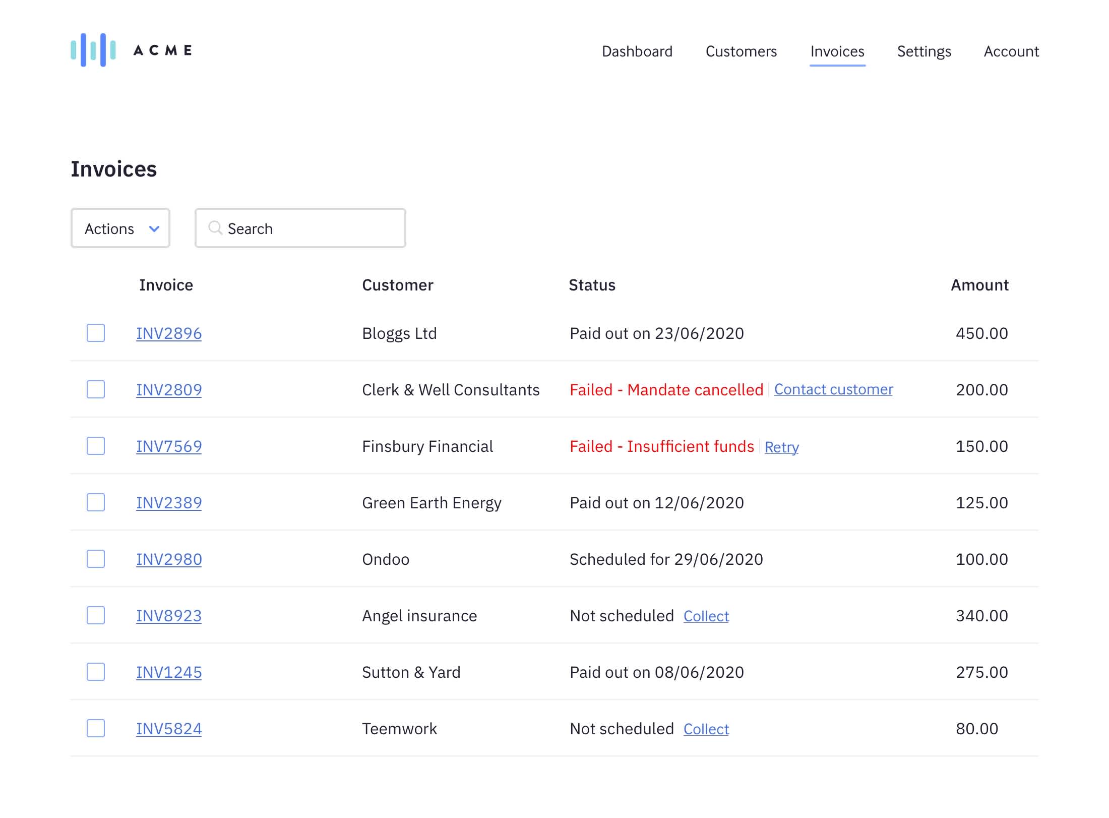 For this section, we’ve imagined a simple invoicing application (called ‘Acme’) to help illustrate the points we’d like to draw your attention to. It’s difficult here to cover absolutely everything you’ll encounter when applying the recommendations below to your integration, but the sections of this guide should serve as a checklist for things you should consider when integrating with GoCardless.