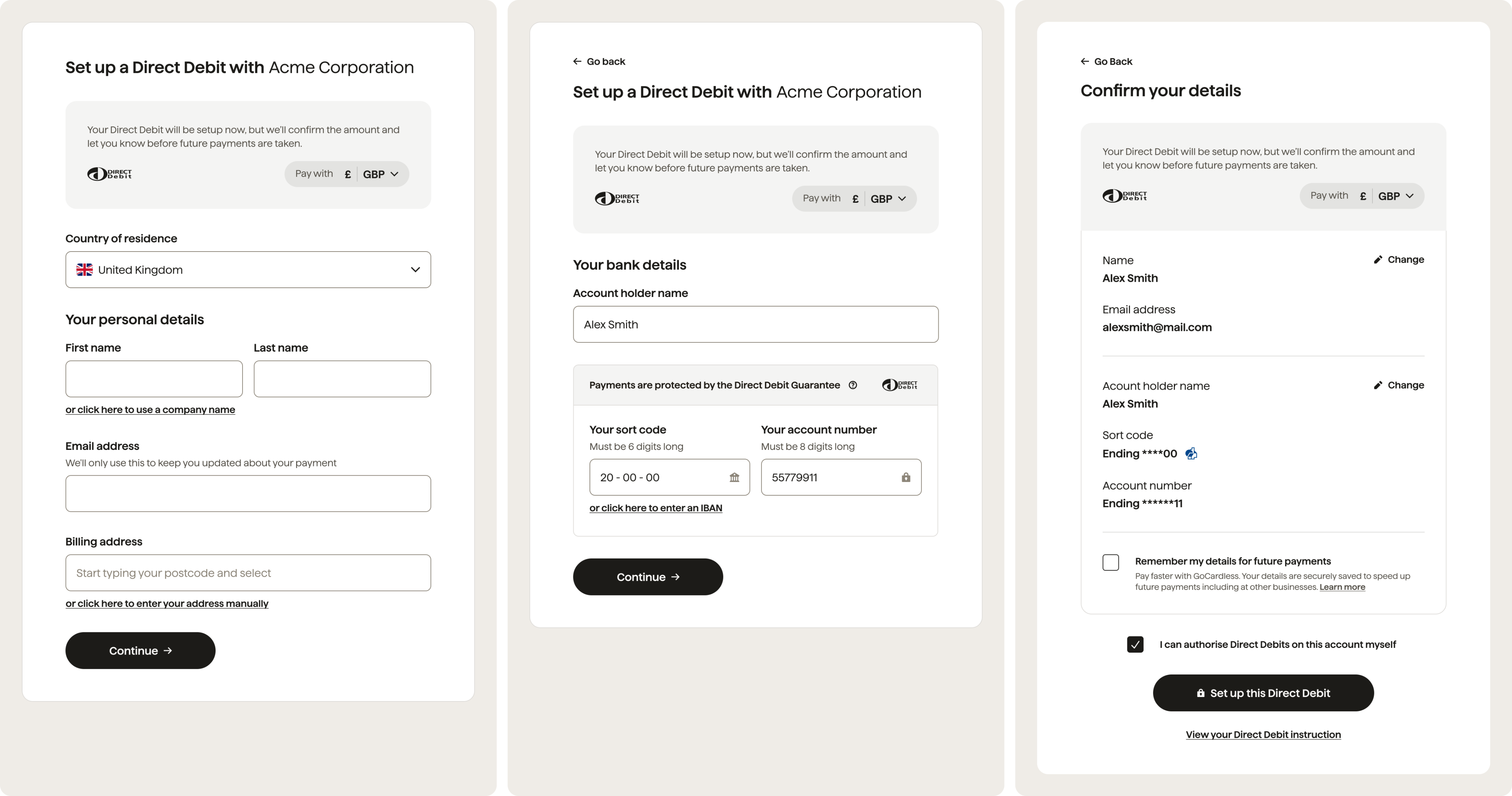 A Billing Request enables you to collect all types of GoCardless payments. For now, we’ll handle a recurring, direct debit (mandate) request.