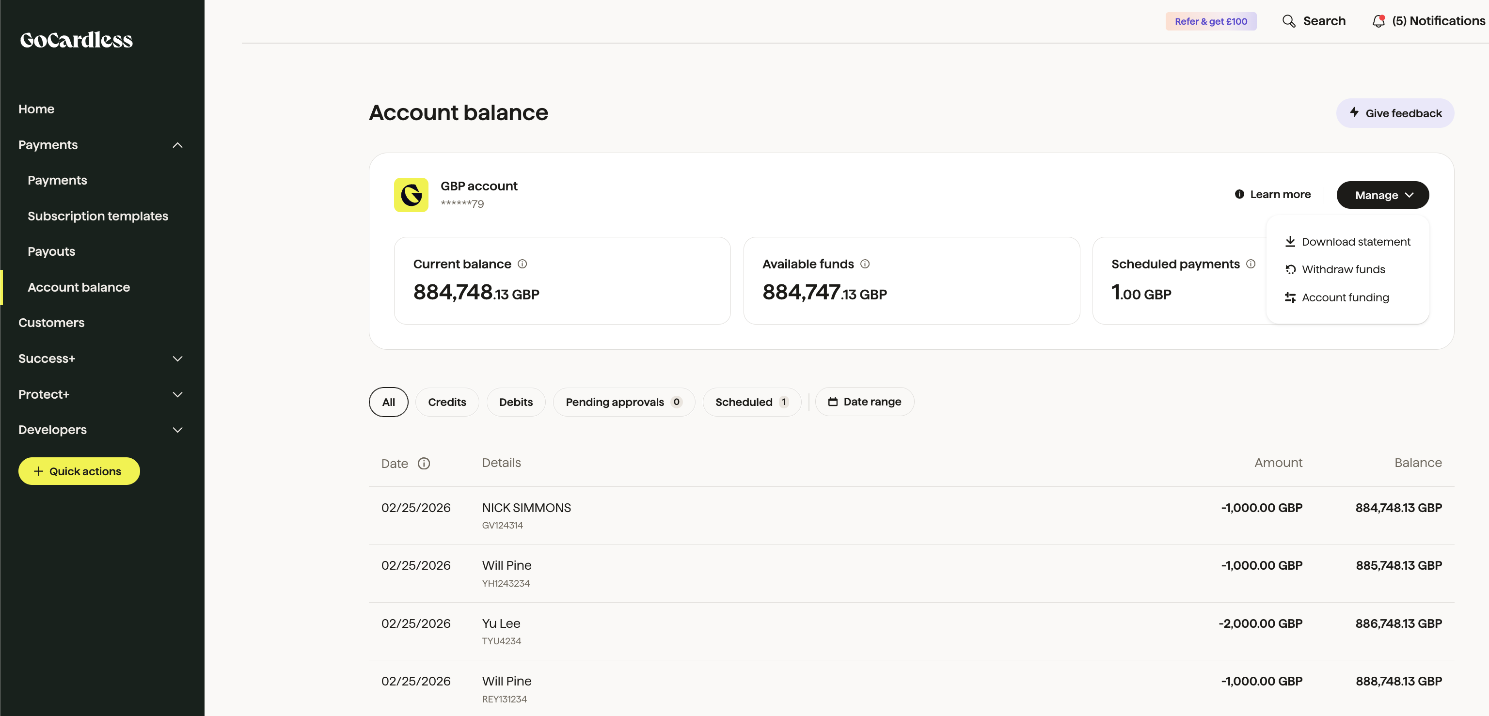 Direct Funding - in this model, you will use your Payment Account bank details to make direct bank transfers to fund the account. If you’re also collecting payments with GoCardless, outbound payments and collection payouts are kept separate: you manage the funding of your Payment Account manually, while payouts from collections are sent directly to your business account.